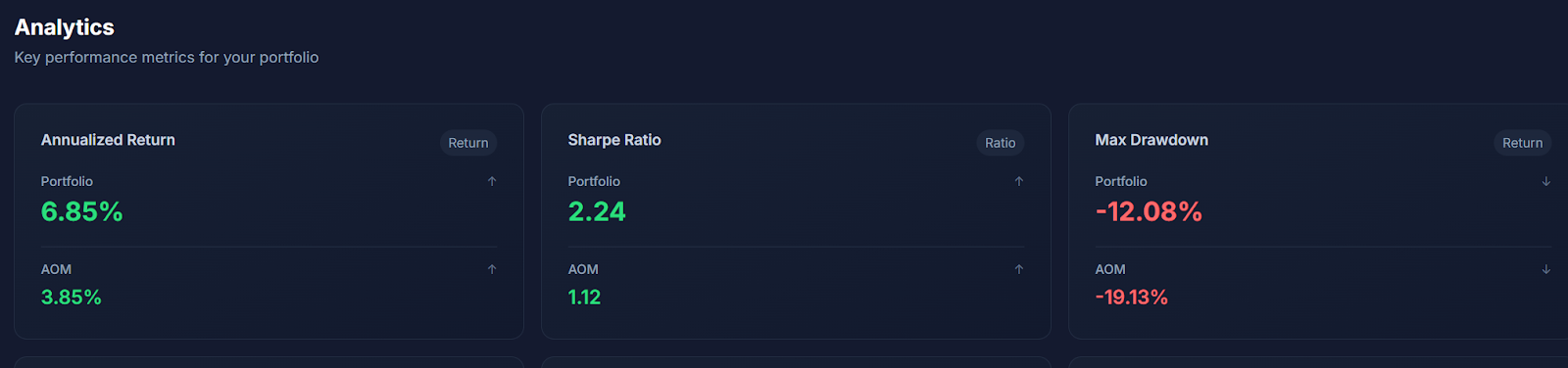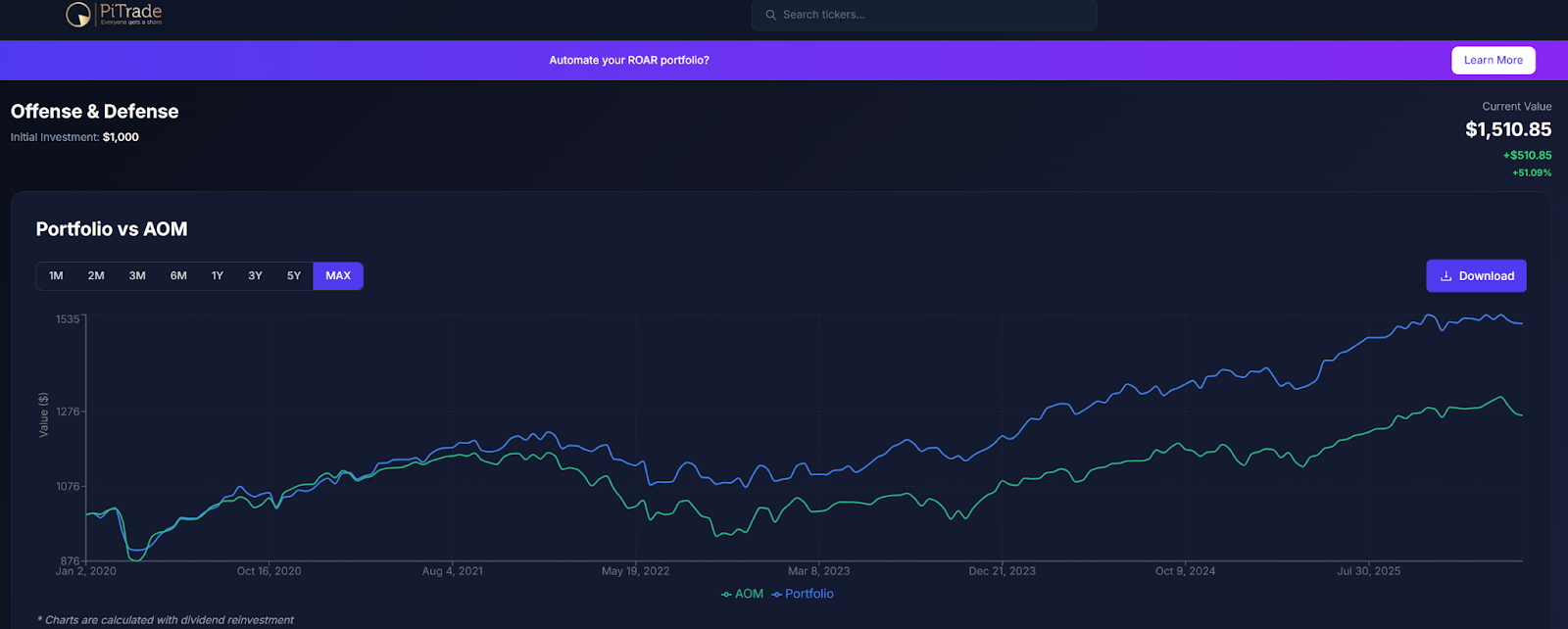 By contrast, two ETFs and a ROAR, if you will, have produced a nearly 7% backtested return with a much lower worst-case drawdown. And a Sharpe Ratio (return per unit of risk) of exactly double that of AOM, the moderate index.