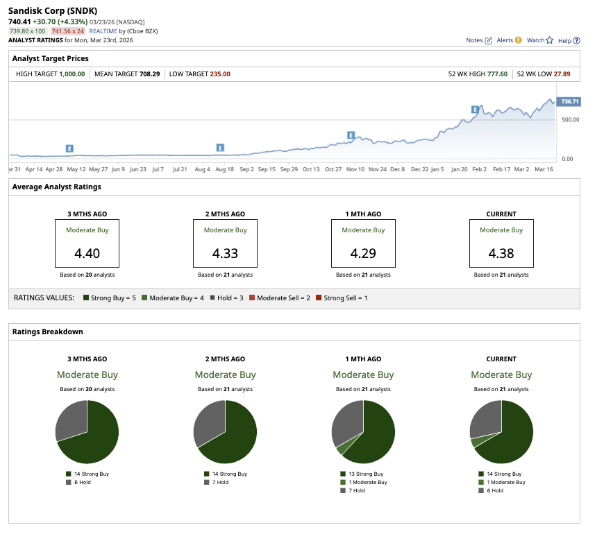 Overall, Wall Street seems moderately bullish about SNDK stock. Of the 21 analysts covering the stock, 14 recommend a “Strong Buy,” one rates it as a “Moderate Buy,” and six suggest a “Hold” rating. The stock is close to surpassing the average price target of $709.22. However, the Street-high estimate of $1,000 indicates that the stock could gain as much as 41% over the next 12 months.