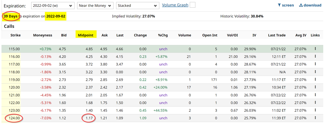 For example, if we look at the Sept. 2 call option chain, investors who sell forward the $124 calls can receive $1.17 per call contract. This can be seen in the Barchart chain below.