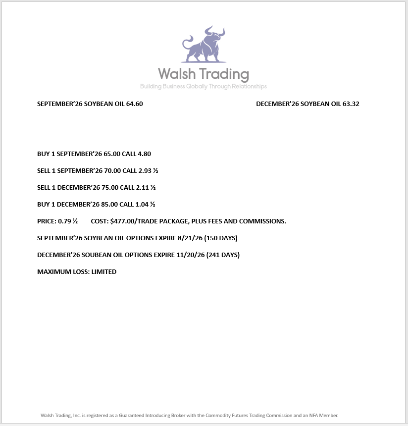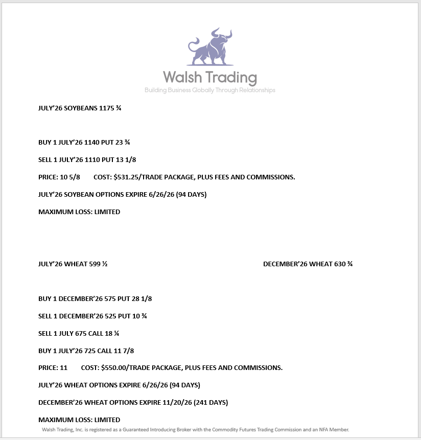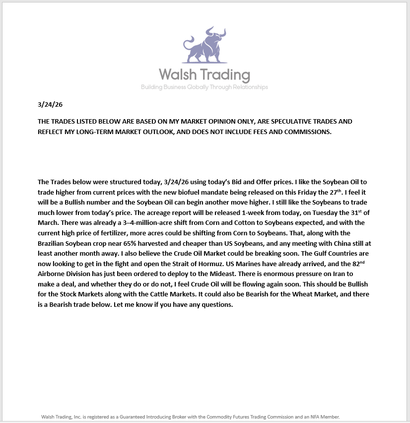 The Grain Markets were mixed today, with the Soybeans trading lower. May'26 Soybeans were 8 ½ cents higher today and settled at 1155. Today's high was 1166 ¾ and the 1-month and contract high is 1238 ¾. Today's low was 1155 ¾ and the 1-month low is 1145 ¼. Since 2/24 May'26 Soybeans are ¼ of a cent higher or fractionally higher. May'26 Corn picked up a few cents today. May'26 Corn was 3 cents higher today and settled at 462 ½. Today's high was 465 ¾ and the 1-month high is 476. Today's low was 459 and the 1-month low is 438. Since 2/24 May'26 Corn is 24 cents higher or almost 5 ½%. The Wheat Market stayed positive today. May'26 Wheat was 2 ¼ cents higher today and settled at 590. Today's high was 596 and the 1-month high is 641 ¾. Today's low was 582 ½ and the 1-month low is 536 ½. Since 2/24 May'26 Wheat is 16 ¾ cents higher or almost 3%. If the Crude Oil Market collapses, it could have a major influence on several of the Grain Markets. The First one would be the Wheat Market, and I feel the Wheat could break substantially if the Crude Oil does as well. I feel that could pressure the Corn Market, but I would not anticipate any major break in the Corn Market. There have been estimates of acres shifting from Corn and Cotton to the Soybeans, and we will know more one week from today when the Planting Intentions Report will be released. There could be a bigger than expected shift from Corn to Soybean with the high cost of fertilizer. I feel this would help to hold the price of Corn steady, and the Soybeans could drop like a rock. However, the new Biofuel mandates should be released this Friday, and I feel the new numbers could be Bullish for the Soybean Oil, and that could help to slow the potential Break in the Soybeans. I still like the July'26 Soybeans trading around 1100, for starters. Brazil has a huge Soybean Crop, and they are about 65% harvested, and cheaper than US Beans. Any future meeting with China has been pushed at least another month away, and they are not likely to do the US any favors. I still like the Future Spreads in the Soybeans, Wheat, Soybean Meal, and Soybean Oil. The Soybean Oil Spreads are the only Bullish Spread I like and buying the August'26 or September'26 contract month and selling the December'26. The Bearish Futures Spreads in the Beans, Wheat and Meal are Selling the July'26 contract month or front month, and buying the back month, or November'26 for the Soybeans, and December'26 for the Wheat and the Soybean Meal. I feel all of these Markets are all about to have a major price adjustment. I have Option Trades ready in every Market, and this could be one heck of a year. Give me a call if you are interested. Have a great night.