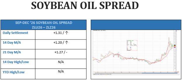 I have recently written about my bullish thoughts on the Soybean Oil market and the Soybean Oil spreads. Nothing is always in commodity futures, but in general, Soybean Oil spreads will follow the direction of the out-right Soybean Oil market. The spreads did start to get away from us, but I believe we might be getting another chance to buy the SEP-DEC ’26 SOYBEAN OIL Spread (ZLU26-ZLZ26). Since January 8th this spread was on the rise floating just above the 14-day and 21-day moving averages the entire time. Then on February 26th it started to spike up way above these two moving averages from a price of 0.83 (83 one-hundredths of a cent) all the way up to 1.85 on March 6th. This took it .75 above both moving averages. It has now settled down somewhat and is back to just above the 14-day and 21-day, settling today at 1.31.