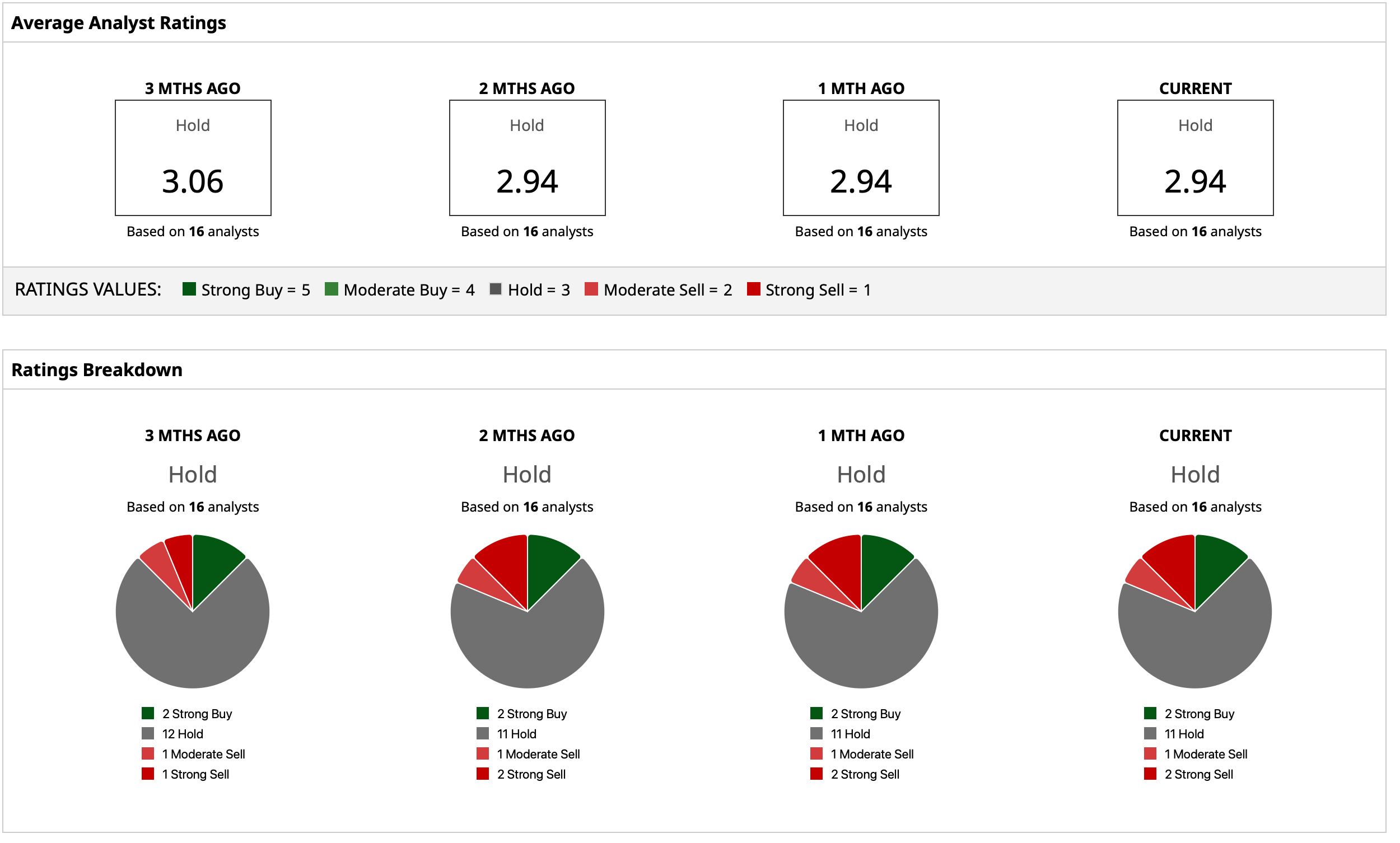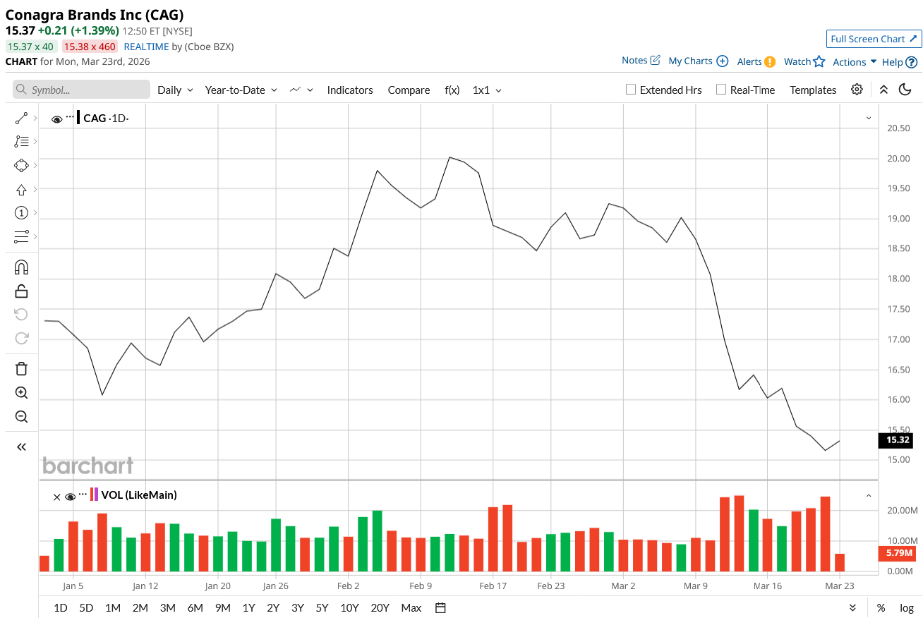 Taking all of this into account, analysts have attributed a consensus rating of “Hold” for CAG stock, with a mean target price of $18.87, which denotes an upside potential of about 23% from current levels. Out of 16 analysts covering the stock, two have a “Strong Buy” rating, 11 have a “Hold” rating, one has a “Moderate Sell” rating, and two have a “Strong Sell” rating.