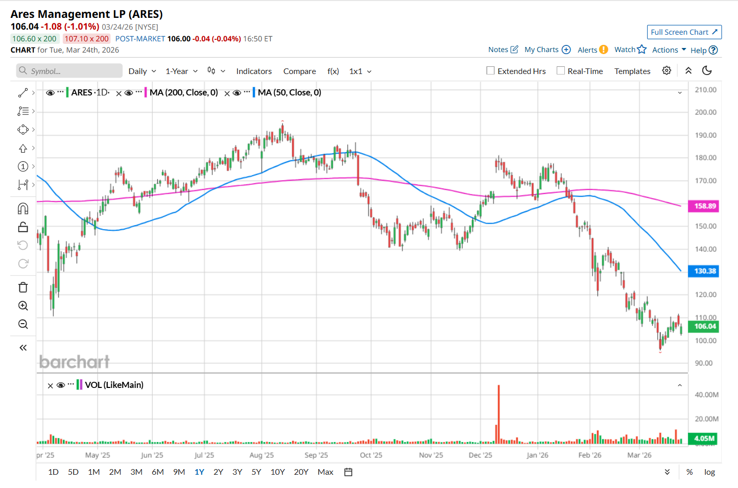 On Mar. 13, shares of ARES rose 5.5%, rebounding from a sharp decline in the previous session driven by sector-wide concerns about credit quality. The stock had dropped significantly after reports indicated that JPMorgan Chase & Co. (JPM) marked down the value of certain loans held by private credit firms and tightened its lending exposure to the sector. This development weighed on the broader private credit industry, as investors became increasingly concerned about deteriorating credit quality. Sentiment was further pressured by heightened scrutiny of private credit funds, with many trading at notable discounts, reflecting growing investor caution. As a major player in the space, Ares Management’s shares were caught up in the broader sell-off before staging a recovery.