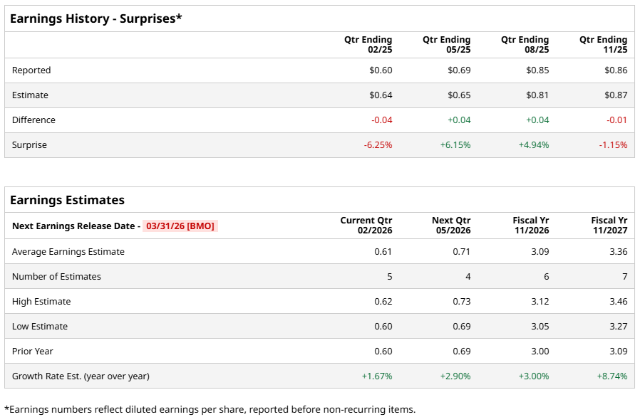 The company is scheduled to release its fiscal 2026 first-quarter earnings results on Tuesday, March 31, before the opening bell. Analysts expect diluted EPS of $0.61, reflecting a modest 1.7% increase from $0.60 in the previous year’s quarter. However, the company has exceeded EPS expectations in two of the past four quarters while falling short in the other two.