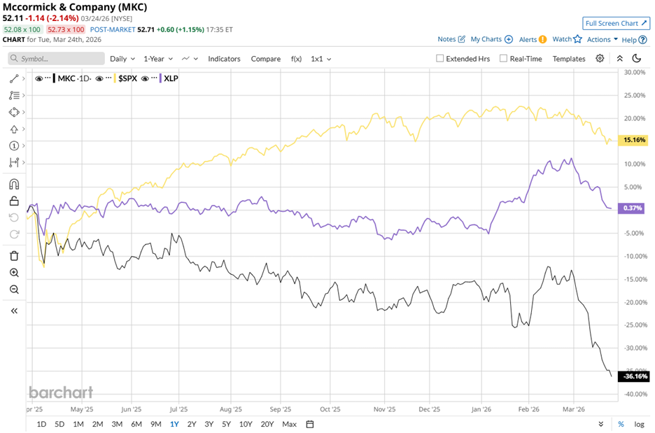 The market, however, has yet to buy into that narrative. Over the past 52 weeks, McCormick’s shares have fallen 35.1%, moving sharply against the grain as the S&P 500 Index ($SPX) gained 13.7%. The disconnect persists in 2026, with the stock down nearly 23.5% year-to-date (YTD), compared to a 4.2% decline for the broader index.