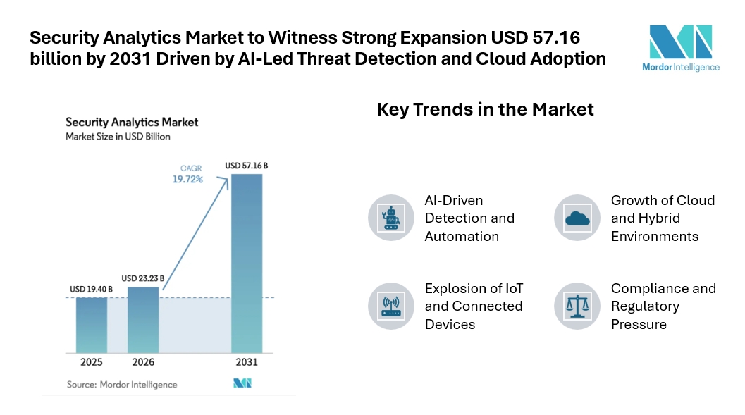 According to industry analysis, the security analytics market size was valued at USD 19.40 billion in 2025 and is estimated to reach USD 23.23 billion in 2026, with projections indicating growth to USD 57.16 billion by 2031 at a CAGR of 19.72% during the forecast period. This strong growth reflects enterprises’ urgent need to detect, investigate, and respond to cyber incidents in real time using intelligent data analysis platforms.