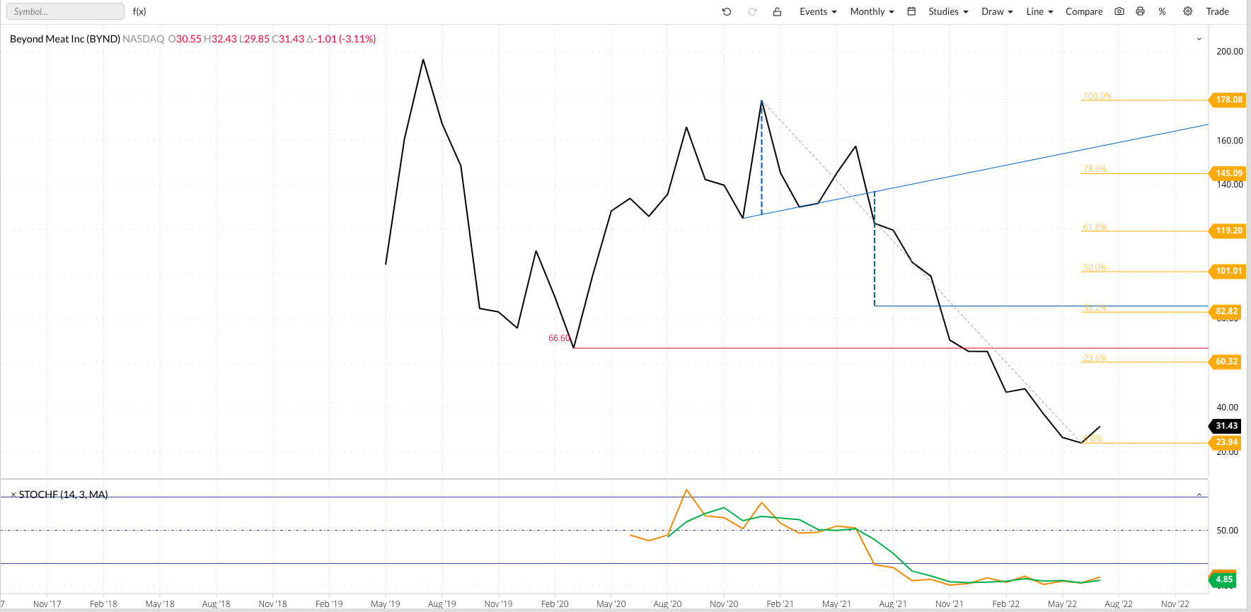 - Technically, BYND has been in a long-term downtrend since completing a head and shoulders pattern on its monthly chart at the end of July 2021.