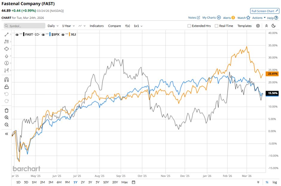 Shares of Fastenal have returned 16.7% over the past 52 weeks, outpacing the S&P 500 Index's ($SPX) 13.7% gain. However, the stock has lagged behind the State Street Industrial Select Sector SPDR ETF’s (XLI) 22.1% surge over the same period.