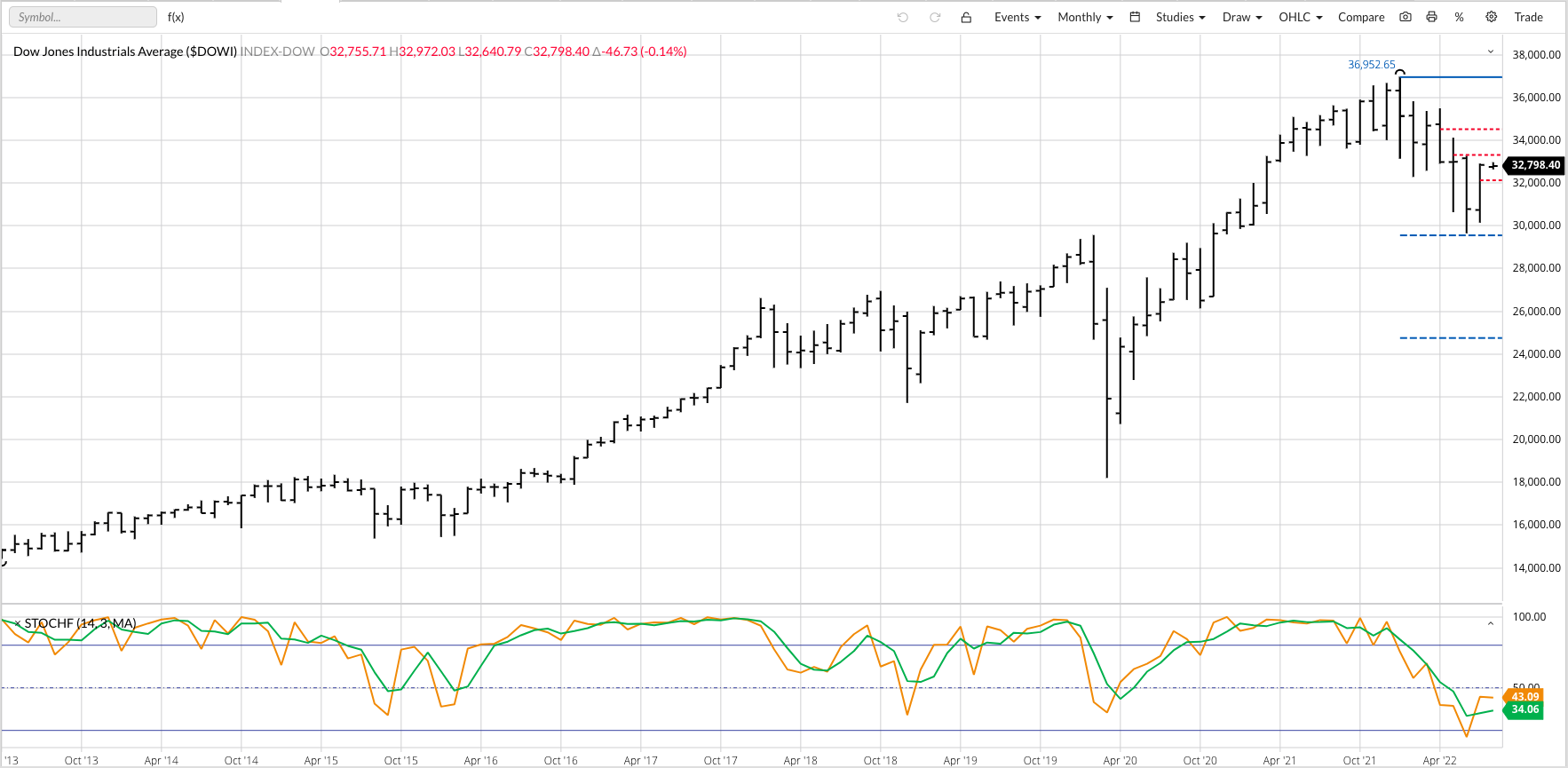 The Nasdaq ($NASX) is interesting in that it could be argued the index completed a bullish 2-month reversal pattern on its monthly chart, indicating its major trend has turned up. The $NASX has been leading the S&P 500 and Dow during this recent downtrend with the peak of the previous uptrend occurring during November 2021. Still, confirmation of a new downtrend did not occur to the $NASX posted a new 4-month low during January. Also note the $NASX has already erased 33% of its value (second dashed blue line) while both the $INX and $DOWI have held above their respective 20% levels (top dashed blue lines).