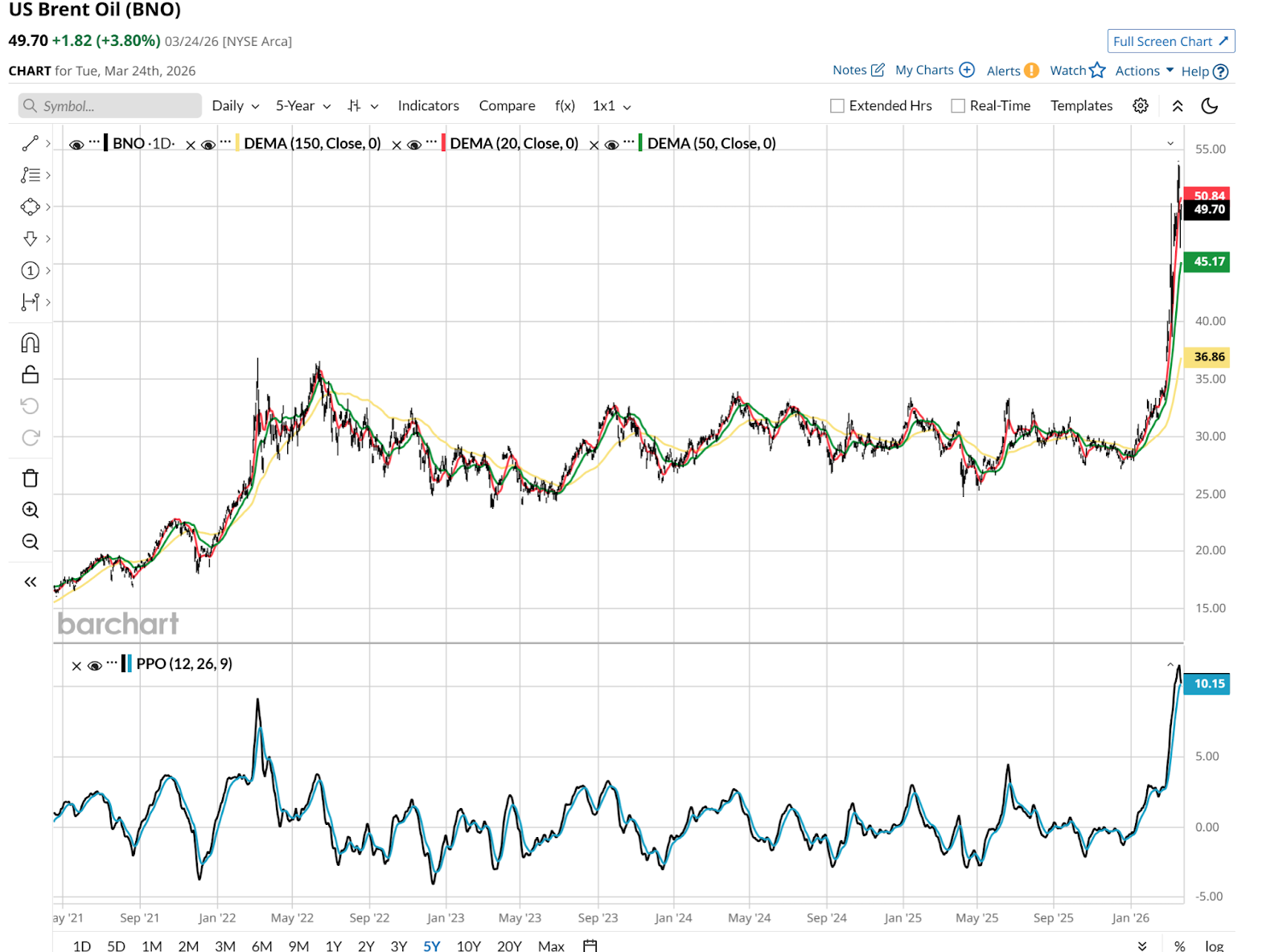 The effective closure of the Strait, which is a narrow 21-mile chokepoint responsible for 20% of the world’s petroleum and nearly one-third of all seaborne oil, has sent Brent crude (CBK26) surging. That has made a sudden and giant winner out of ETFs like the US Brent Oil ETF (BNO).