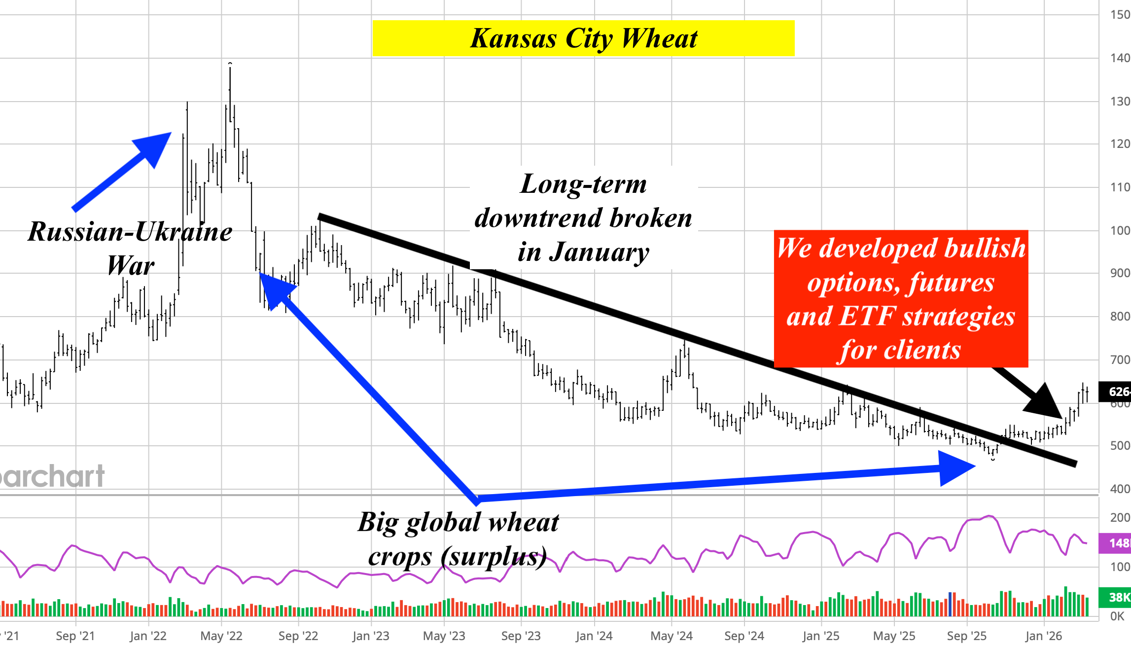 Image Source: Chart by Barchart.com, superimposed captions and markings by Weather Wealth Newsletter