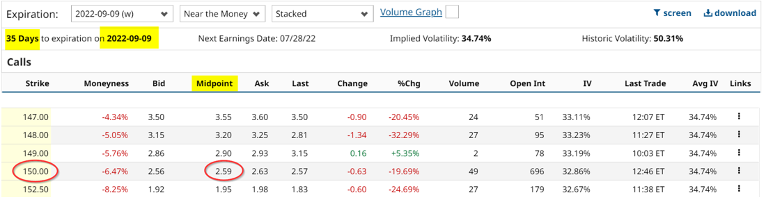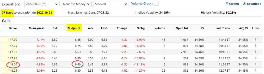 Another play below is longer dated - for Oct. 21. It shows that the $148 strike price calls are priced in the midpoint at $6.40 per contract.