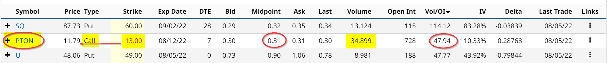 The open interest by the end of the day on Aug. 5 was 1,584 contracts, so a large portion of those call option contracts has been sold already. Nevertheless, this short-dated activity in the PTON calls at the $13.00 strike for expiration on Aug. 12 indicates that investors still think there is room for PTON stock to spike higher.