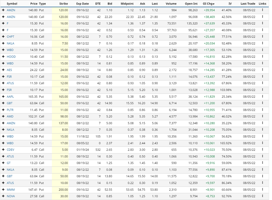 Amazon (AMZN), Ford (F), ChargePoint (CHPT) and Robinhood (HOOD) saw some of the largest changes in open interest last week.