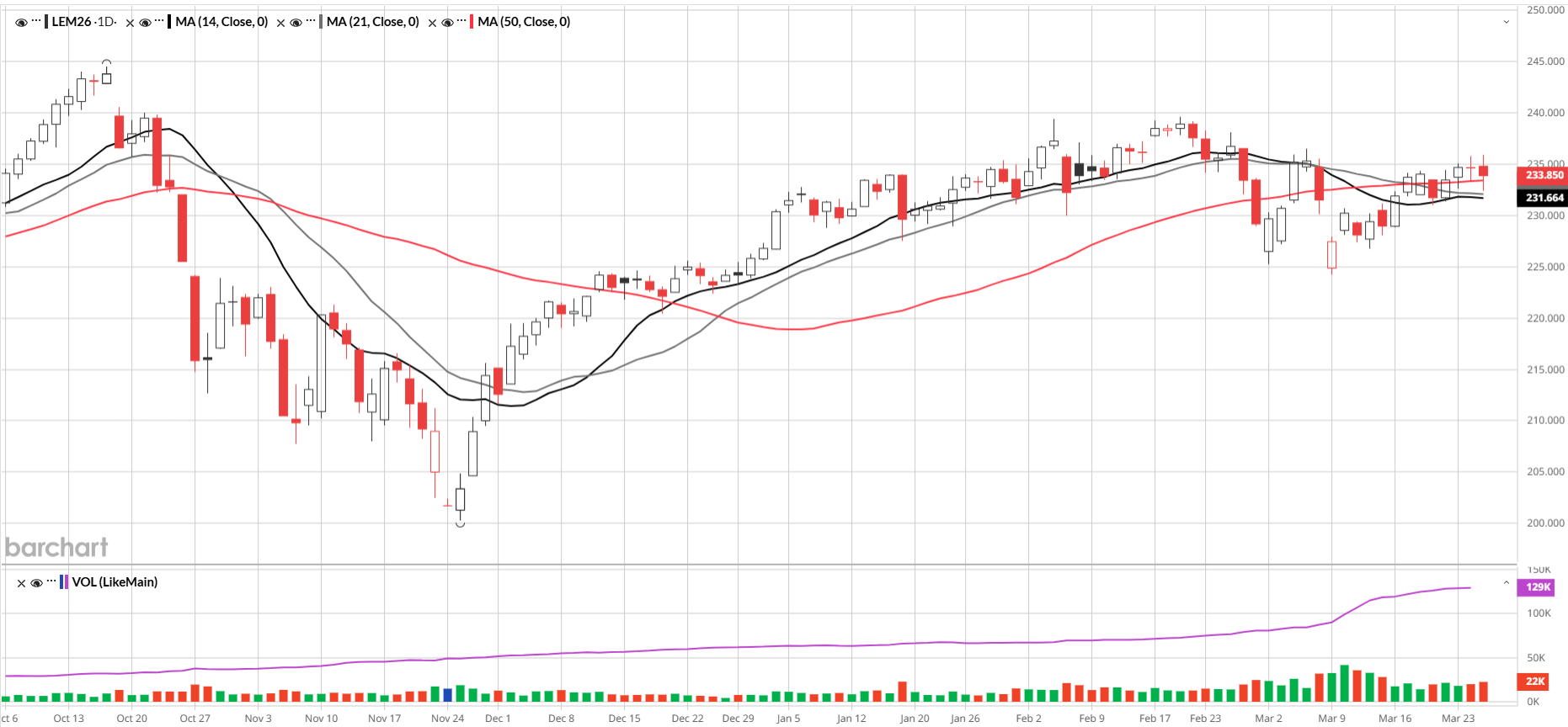 Live Cattle bounced off the 100-day moving average on March 9 and is now building a positive short-term trend. Crude oil was lower this morning and stocks indexes were higher because of peace talks, even though Iran reportedly rejected the US proposal to end the war. A rally in the equity markets should be bullish for cattle. The market has shaken off Friday’s somewhat bearish Cattle on Feed report. While, the impact of the JBS strike in Colorado seems to have been most of the way priced in, in anticipation of the strike.