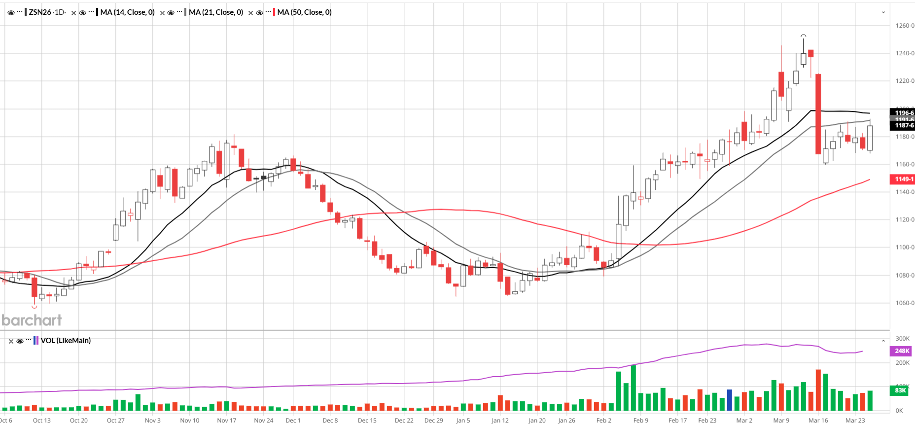 The grain markets have been trading a lot on headlines recently. That was true again today, with soybeans rallying at midday after it was reported that President Trump plans to visit China on May 14-15. There was already a 4-million-acre shift from corn and cotton to soybeans expected. High fertilizer prices could increase the rotation to soybeans even further. The acreage report will be released on Tuesday, March 31, along with the Grain Stocks report. Brazil’s soybean harvest is near 65% complete and cheaper than US soybeans. July soybeans closed below the 14 and 21-day moving average. Support is at the 50-day moving average.