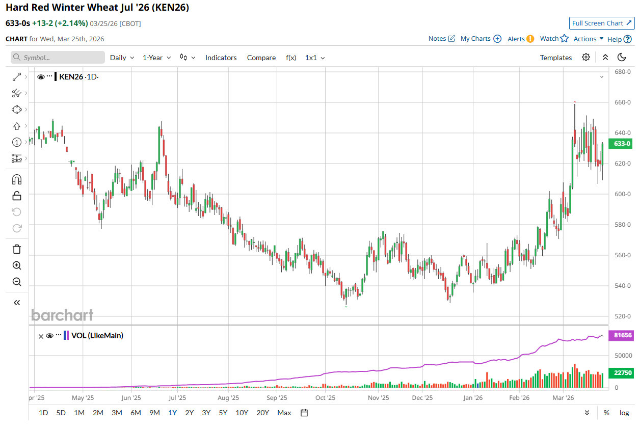 The market bounced back sharply from early weakness and finished strong, especially in Kansas City as Plains rains are being pushed a little further out in time and a little further east. Dryness relief will now be limited over the next 10 days and temperatures will be very warm in the Plains, besides a brief cold spell this weekend. Highs in the 80s and 90s and a few 100 readings are possible in the southwest Plains. Dry and windy conditions are expected and not what the HRW crop needs. There are some precipitation chances in the forecast 10 days out and beyond, but confidence is fading. Other wheat news is very limited today and prices were supported by the strength in corn and beans. Until the Iran conflict completely ends, geopolitical risk will remain supportive. However, weather in the Plains is becoming a more important bullish factor. Outside reversals seen today led by July KC wheat. This contract continues to close within the pennant formation, close above $6.50 would start a breakout to the upside, close below $6.17 would be a failure in my opinion. Trade idea below. We aren’t staying at present levels in my opinion.