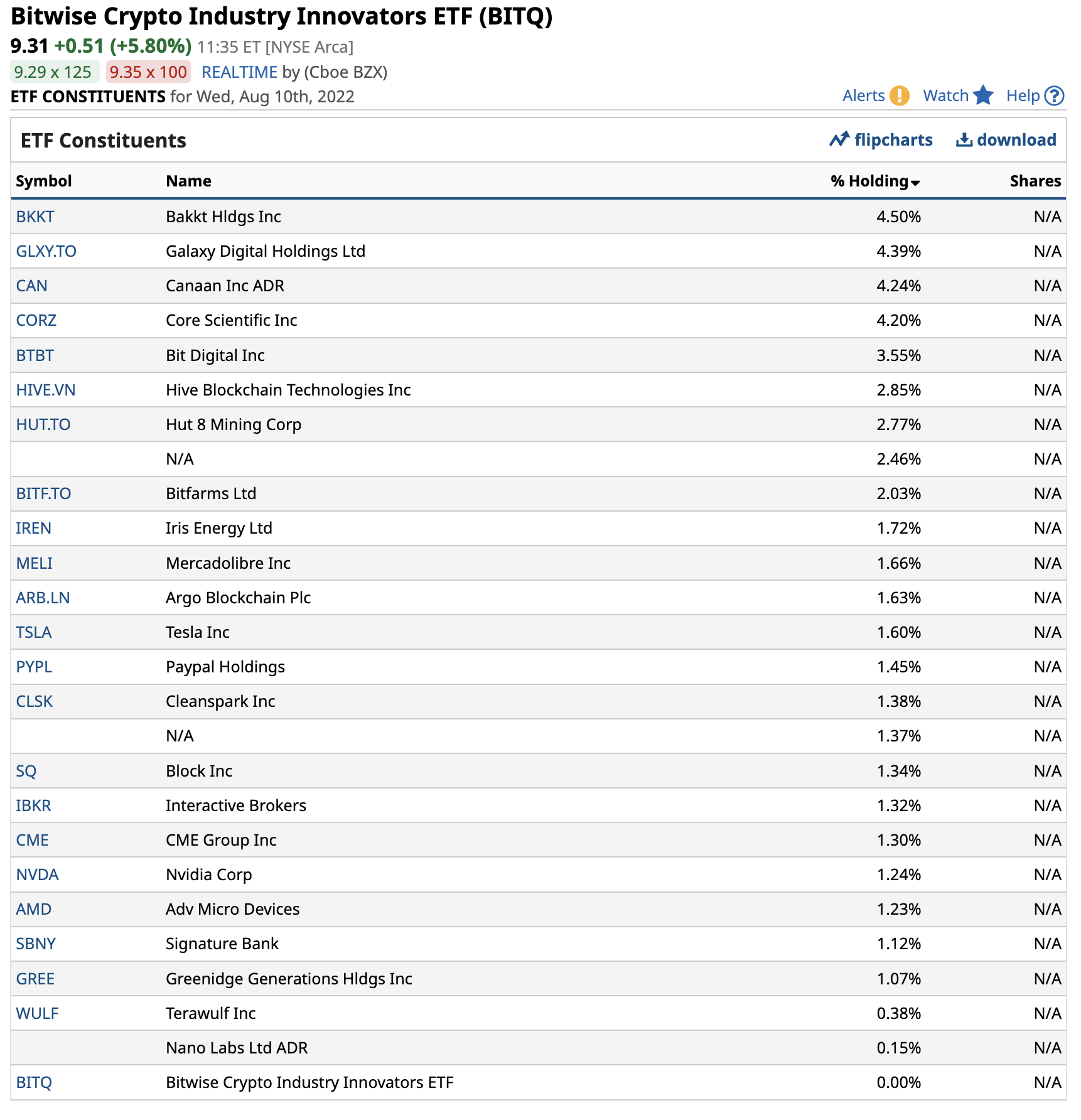 The Bitwise Cryptocurrency Industry Innovators ETF product (BITQ) holds shares in many cryptocurrency-related leading companies trading in the stock market. BITQ is a kind of Bitcoin soup or stew as it owns miners, platforms, lenders, and other businesses whose profits rise and fall with crypto prices.
