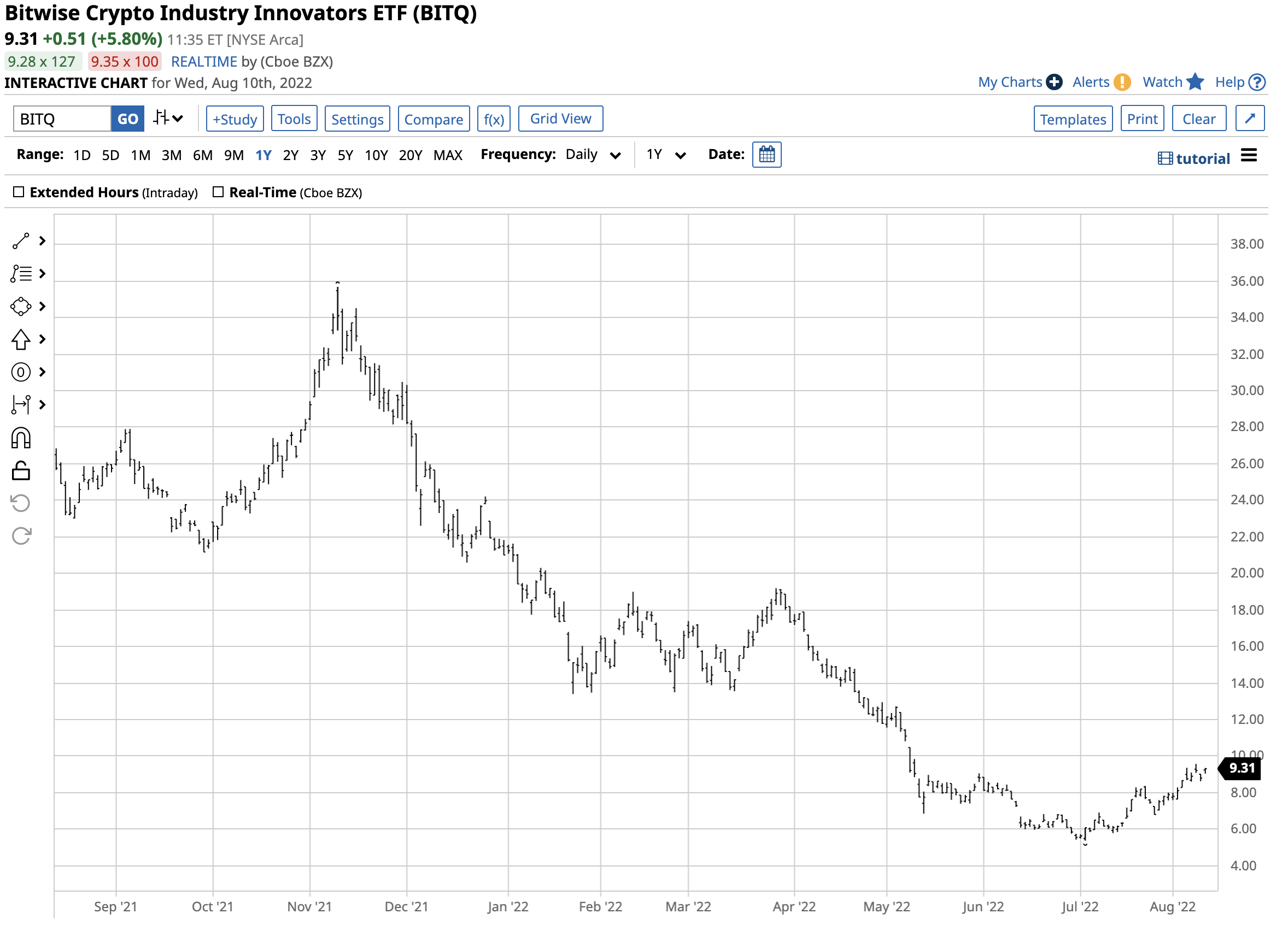 The chart highlights the decline from $35.68 on November 9, 2021, to a low of $5.39 per share on July 5, 2022, an 84.9% drop. At the $9.31 level on August 10, the BITQ ETF recovered 72.7% from the early July low.