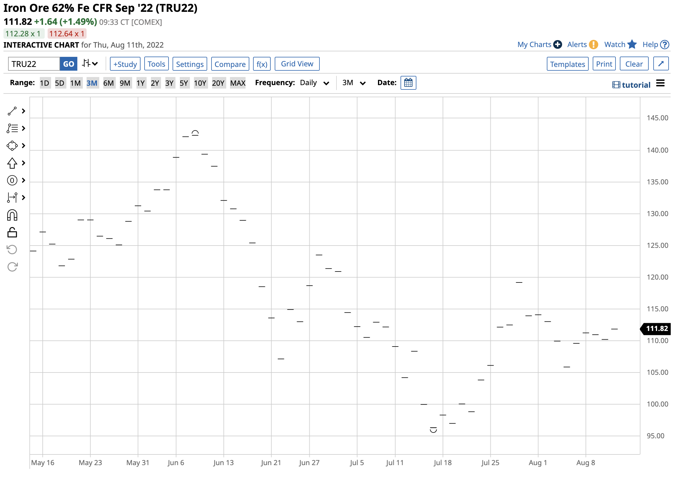 The chart shows iron ore’s price rose from a low of $96.30 on July 15 to over the $111.80 level on August 11. Meanwhile, gold, silver, and other metal prices have recovered over the past weeks. Industrial commodity prices have stabilized despite the 75-basis point Fed Rate hike in July and the prospects for further increases over the coming months.