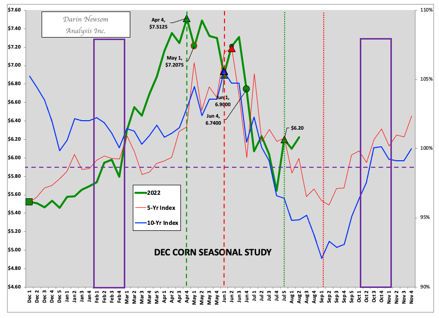 There will be a lot of talk about numbers in the corn market Friday, but the only numbers that matter are $6.20 and $6.10. If we look at my seasonal study for December corn (ZCZ22) we see the previous 4-week high weekly close was $6.20 from two weeks ago. If Dec22 closes above that mark this week, then it would confirm the contract has made an early start on its seasonal uptrend and indicates the harvest low has likely been established. However, last week saw Dec22 close at $6.10 (in both cases, note corn’s Round Number Reliance[iv]) so a close below that mark would open the door to a possible test of the low weekly close at $5.6425 (fourth week of July). Thursday saw December close at $6.2775, so we would naturally think a bullish close would be fairly safe. Normally, yes, but there is the little problem of USDA’s latest round of imaginary supply and demand numbers standing in the way of Friday’s close. Do I think this monthly bit of silliness changes anything about the corn market? No. Long-term fundamentals will still be bullish at the end of the day and the low weekly close will still be in place.Â
