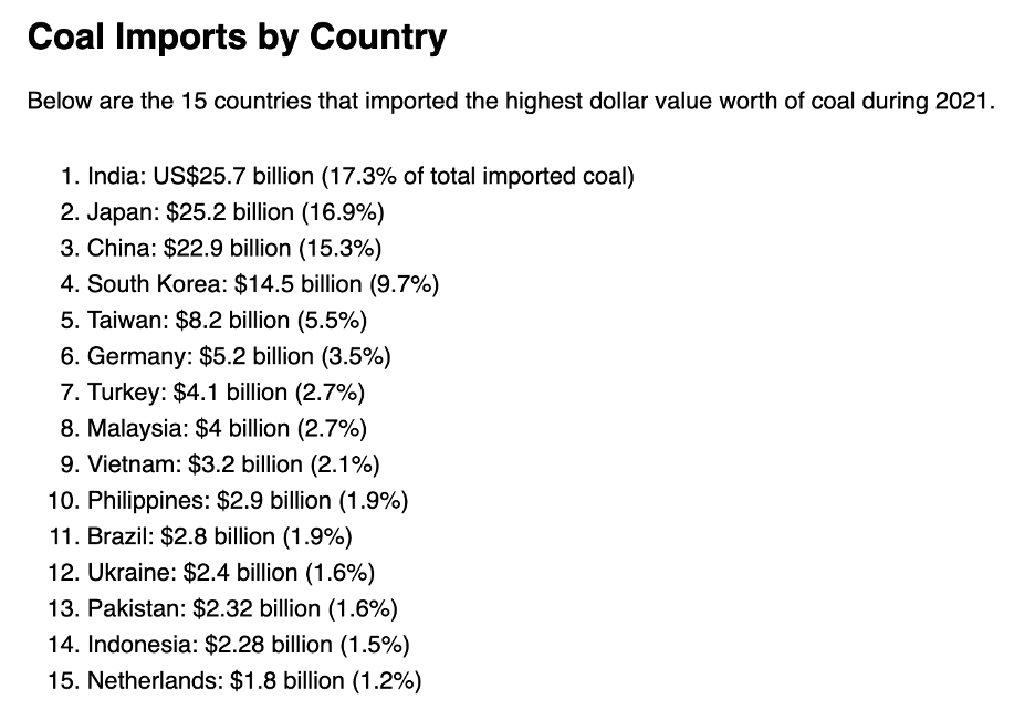 The chart shows that India, Japan, and China are responsible for 49.5% of the world’s annual coal imports.Â