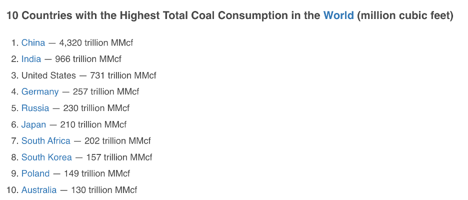 China, India, and the US are the leading coal-consuming countries, and Australia is tenth.Â