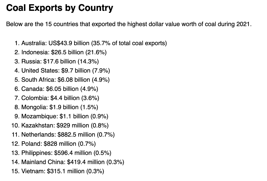 Australia produces far more coal than its domestic requirements. In 2021, Australia was the leading coal exporting country:Â