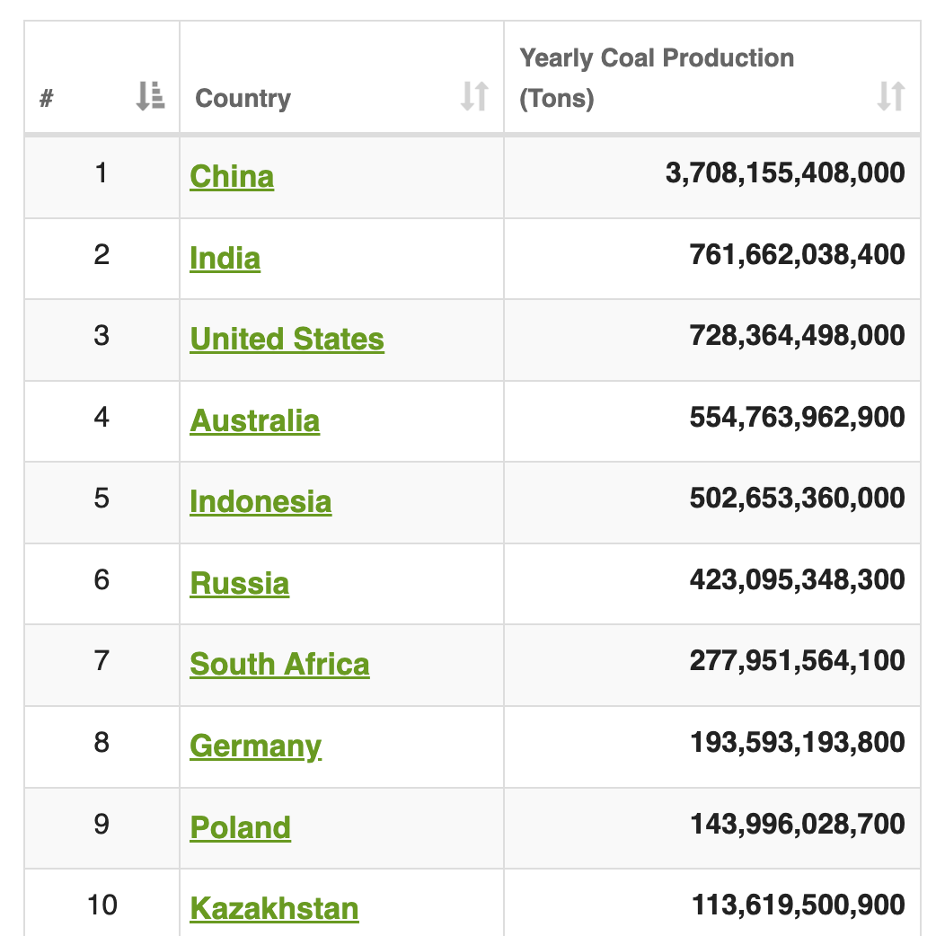 China is by far the world’s top coal producer. India is second, and the US is a close third. Australia rounds out the top four.