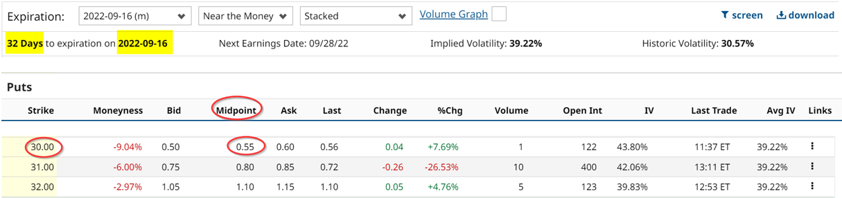 The next under table from Barchart shows that the $36 strike price calls that expire on Sept. 16, 32 days from now, have an attractive premium.