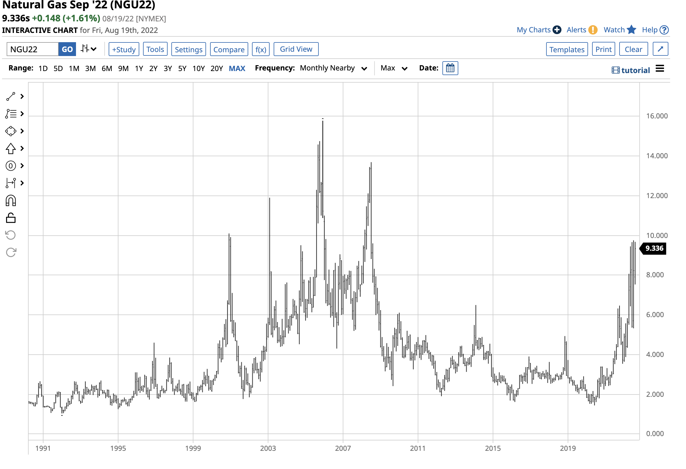 As the chart illustrates, September US natural gas futures at above the $9 per MMBtu level are at the highest price since 2008.