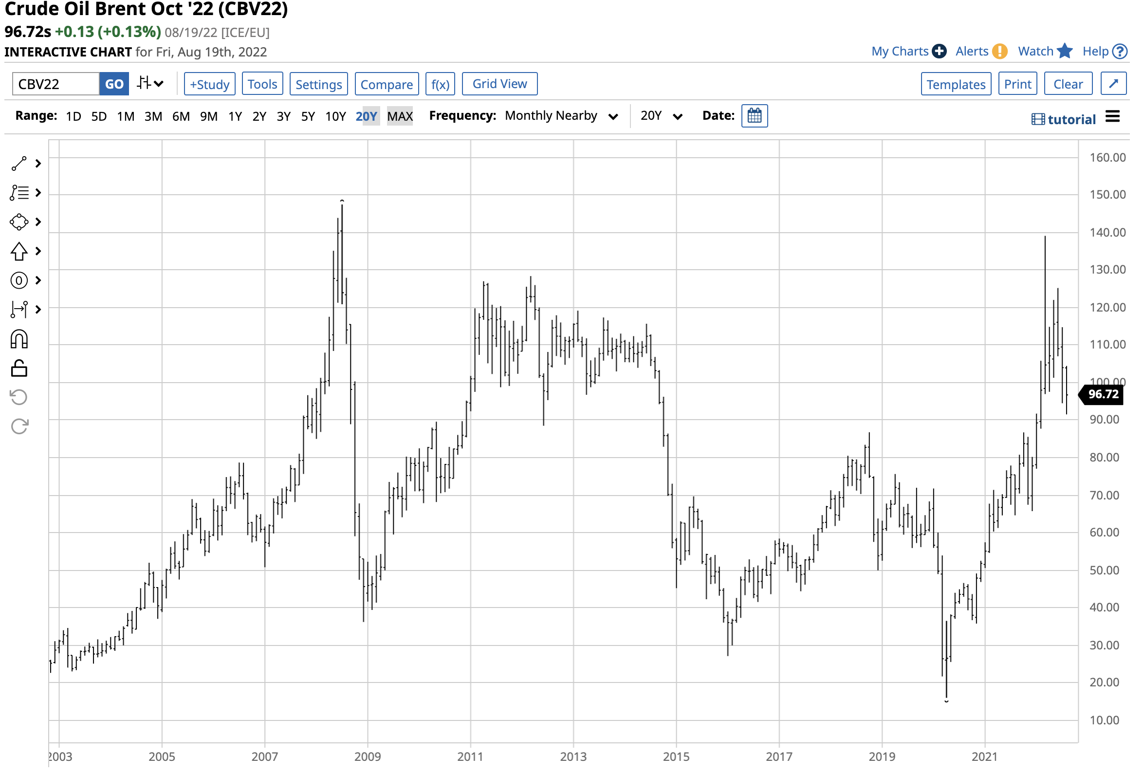 The chart shows that after reaching the highest price since 2008 at $139.13 per barrel in March 2022, Brent crude oil futures declined to the $91.51 level on August 17. Grain prices have also pulled back after CBOT wheat reached a record high in March, and corn and soybean futures prices reached levels just below the 2012 all-time peaks over the past months.