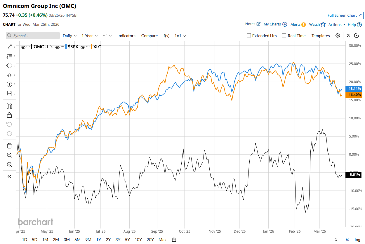OMC stock has declined 5.8% over the past 52 weeks, underperforming the S&P 500 Index’s ($SPX) 14.1% rise and the State Street Communications Select Sector SPDR ETF’s (XLC) 11.5% rise during the same time frame.