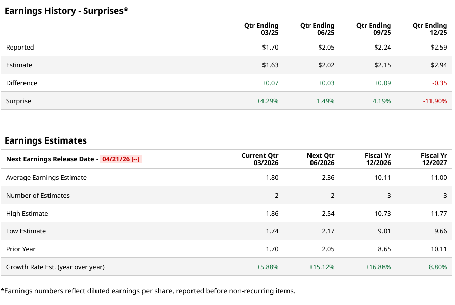 For fiscal 2026, analysts expect the company to report an EPS of $10.11, indicating a 16.9% rise from $8.65 reported in fiscal 2025. Moreover, its EPS is expected to rise nearly 8.8% year over year (YoY) to $11 in fiscal 2027.