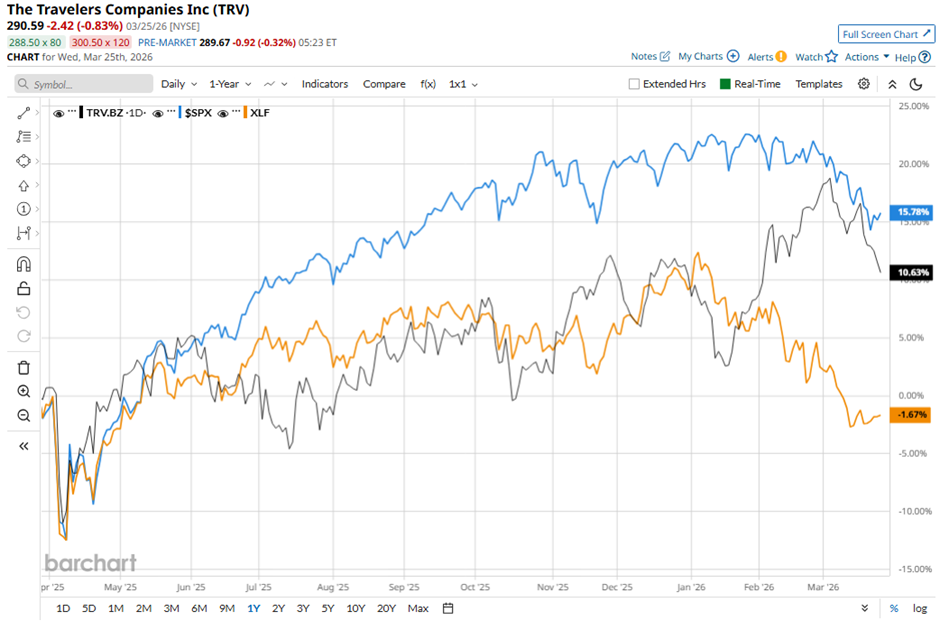 Shares of TRV have increased 12% over the past 52 weeks, lagging behind the S&P 500 Index's ($SPX) 14.1% gain. However, the stock has outpaced the State Street Financial Select Sector SPDR ETF's (XLF) 2.2% decline over the same period.