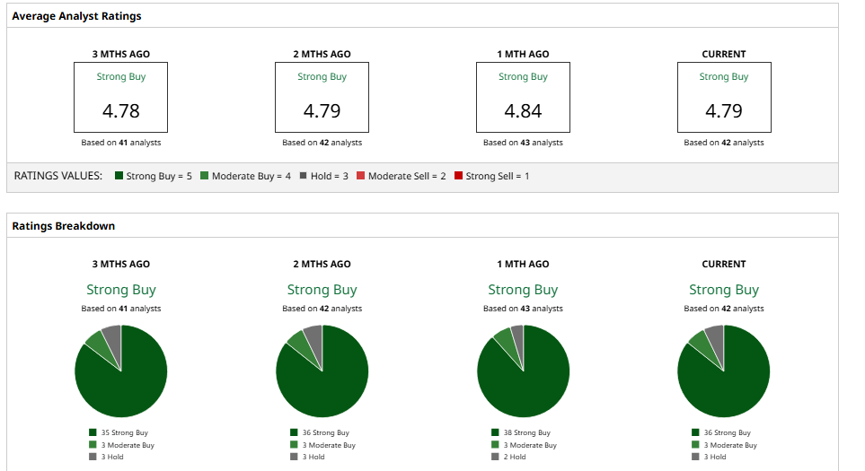 The consensus rating from Wall Street is a “Strong Buy” based on 42 analysts with coverage. The average price target stands at $466.12, signaling potential upside of about 46% from current levels.
