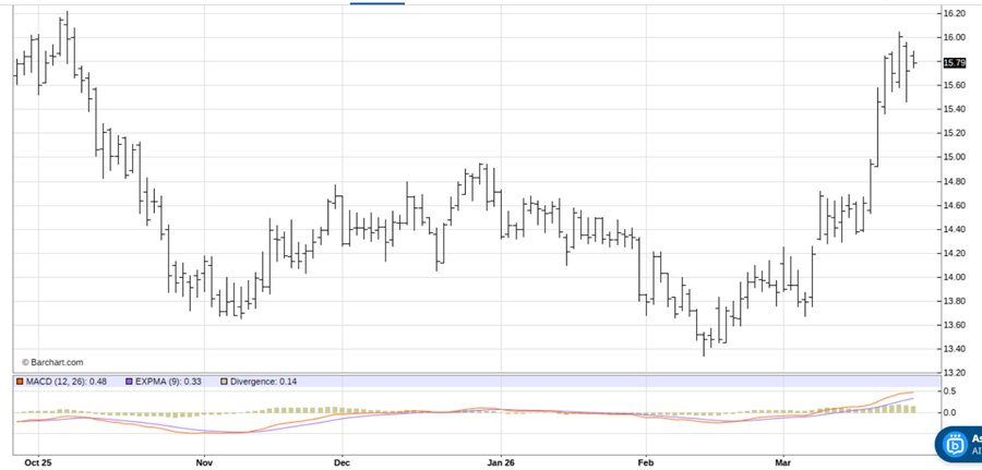 See on the daily bar chart for July sugar futures that prices are trending up and this week hit a 5.5-month high. See, too, at the bottom of the chart that the moving average convergence divergence (MACD) indicator is in a bullish posture as the blue MACD line is above the red trigger line and both lines are trending up. The sugar bulls have the near-term technical advantage.