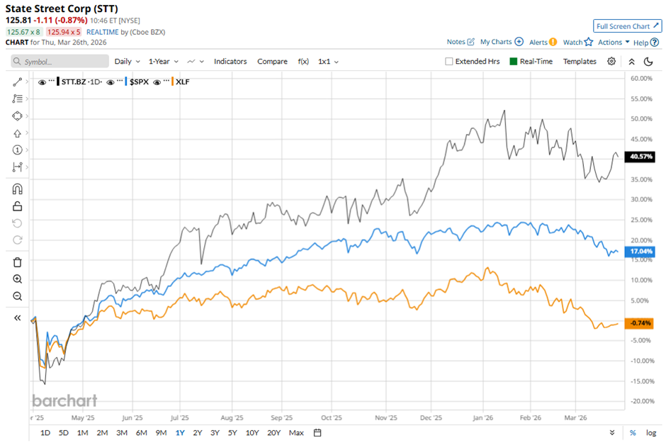 STT stock has jumped 36.3% over the past 52 weeks, surpassing the S&P 500 Index's ($SPX) 14.9% gain and the State Street Financial Select Sector SPDR ETF's (XLF) 1.7% decline over the same period.