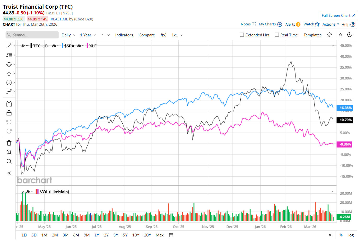 Shares of TFC have gained 6.7% over the past 52 weeks, underperforming the S&P 500 Index's ($SPX) 14.1% return over the same time frame. However, it has outpaced the State Street Financial Select Sector SPDR ETF’s (XLF) 2.2% drop over the same time period.