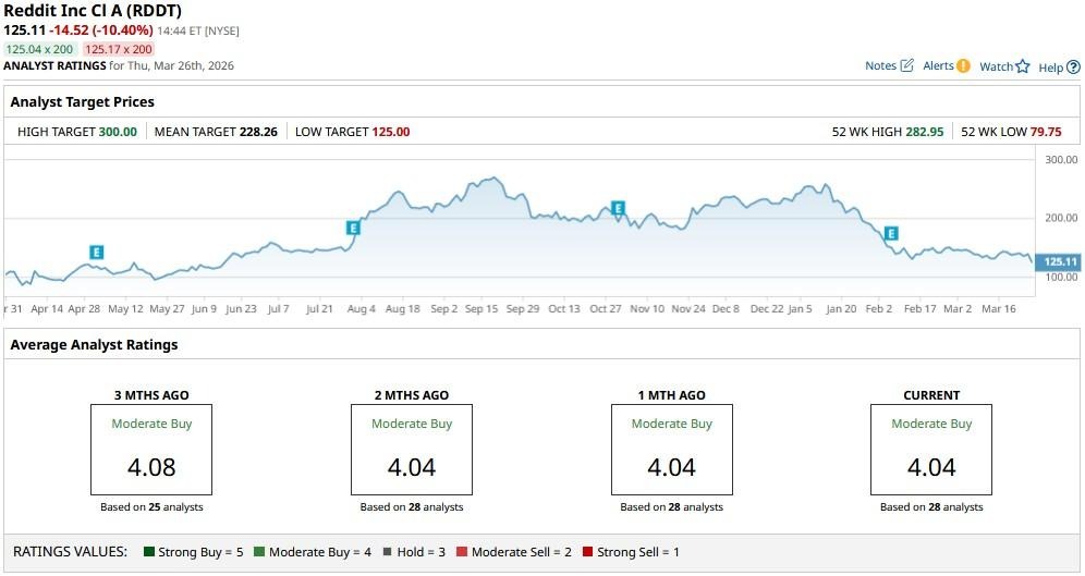 The consensus rating on RDDT stock sits at a “Moderate Buy,” with the mean price target of $228 indicating potential upside of more than 80% from here.