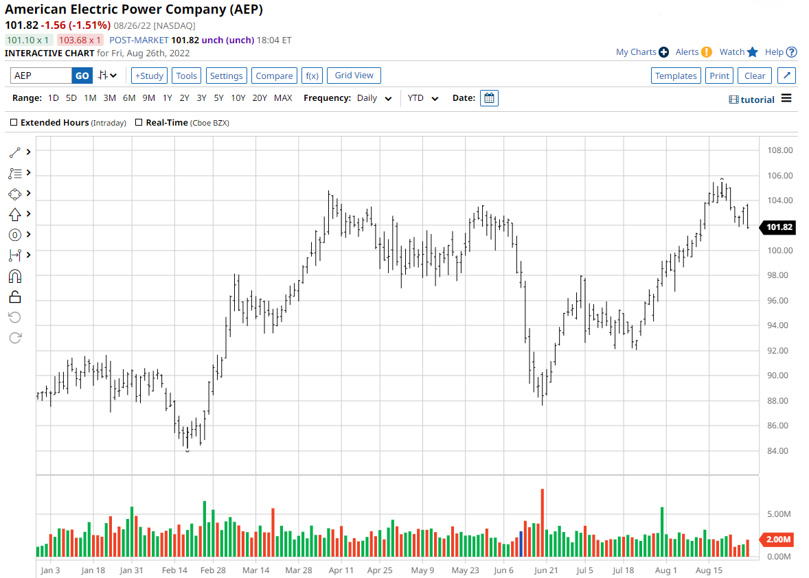 AEP is trading up 14.4% in 2022, and only dropped 1.51% during Friday’s Fed induced sell-off. The stock yields 3% and its beta is just 0.36. Out of the 13 indicators that comprise the Barchart Technical Opinion, 11 of them rate AEP a Buy.