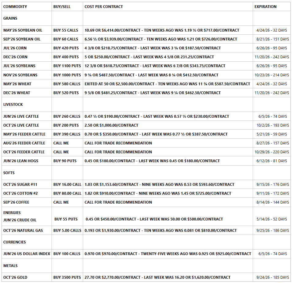 The Livestock Markets were all higher today, with the April'26 Feeders closing above 355.00 today. June'26 Live Cattle were 95 cents higher today and settled at 234.80. Today's high was 235.20 and the 1-month high is 236.47 ½. Today's low was 234.80 and the 1-month low is 224.22 ½. Since 2/26 June'26 Live Cattle are 1.40 higher or about 1/2%. The May'26 Feeders settled near the highs and gained almost 2-dollars. The May'26 Feeder Cattle were 1.70 higher today and settled at 351.75. Today's high was 352.22 ½ and the 1-month high is 357.80. Today's low was 347.80 and the 1-month low is 336.45. Since 2/26 May'26 Feeder Cattle are 3.55 lower or 1%. The Hogs stopped the slide lower yesterday, barely, and managed to close positive again today. June'26 Lean Hogs were 17 ½ cents higher today and settled at 104.30. Today's high was 104.55 and the 1-month high is 111.50. Today's low was 103.85 and the 1-month low is 102.95. Since 2/26 June'26 Lean Hogs are 5.62 ½ lower or more than 5%. The Cattle Markets continue to push ahead, despite strong headwinds coming from the Stock Markets and the Crude Oil Markets. Maybe, some think the war with Iran could be over soon, and are taking advantage of Cattle prices now, before the outside markets correct, which could catapult the Fats and Feeders over the 1-month highs. It is just a thought, but the Fats and Feeders had nice gains today, with the Crude Oil Market more than 4-dollars higher, and the Dow Jones Index more than 500 points lower. If the strike in Colorado ends, it would also be a big shot in the arm for the Cattle Markets. WOW, as I am typing this the Crude Oil Market just broke $4.50 in about 15 seconds, with the Dow jumping 250 points. The Dow is down 250 points still, but the Crude recovered and is now $2.50 higher on the day. Crazy markets, but that was a great example of how quickly the Crude Oil Market could break when the Oil starts flowing through the Strait again. I still recommend buying your Crude Oil Puts now while you still can, and Put Spreads make it a lot cheaper to get closer to the at the money strike. It is going to be a crazy year, full of opportunity. Give me a call if you are ready.