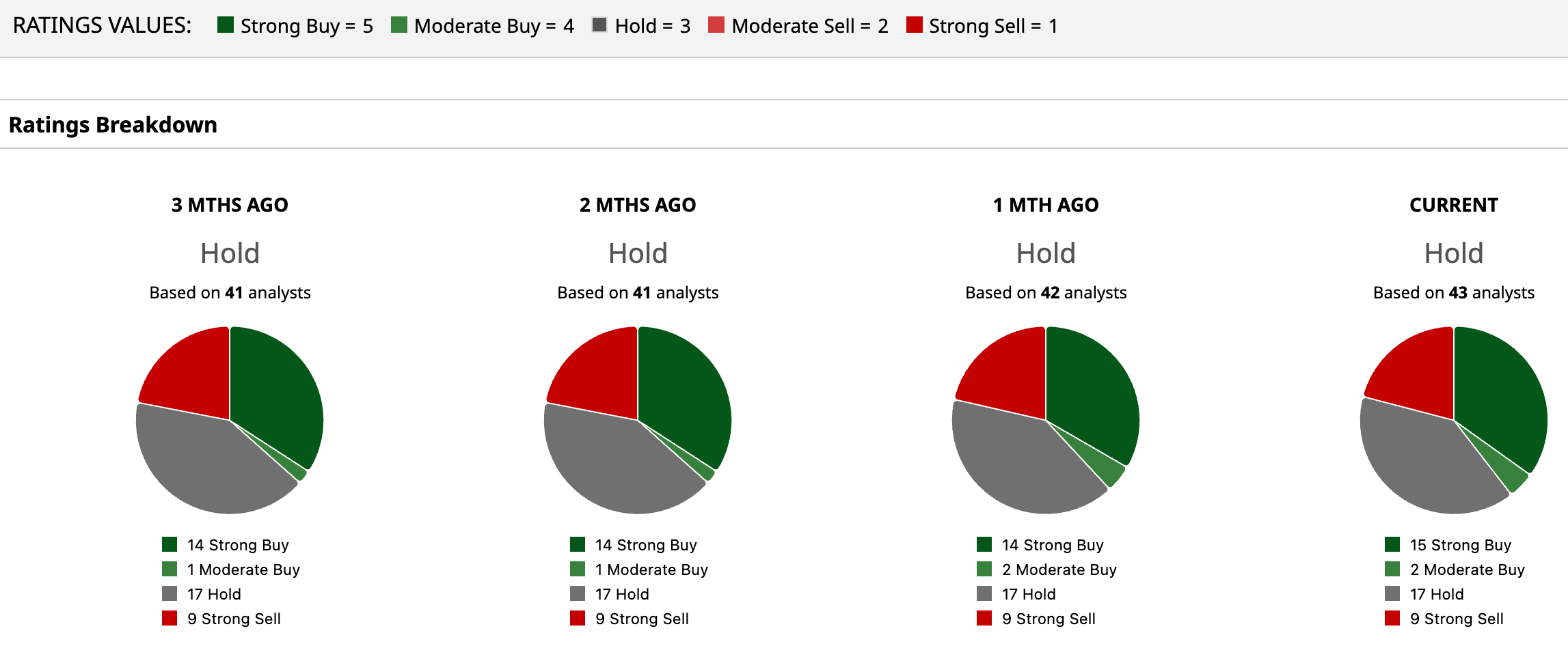 Currently, the broader analyst community has assigned the stock an overall rating of “Hold.” Among 43 analysts covering the stock, 15 have rated it a “Strong Buy,” two suggest “Moderate Buy,” 17 opt to “Hold,” while nine have flagged a “Strong Sell.”