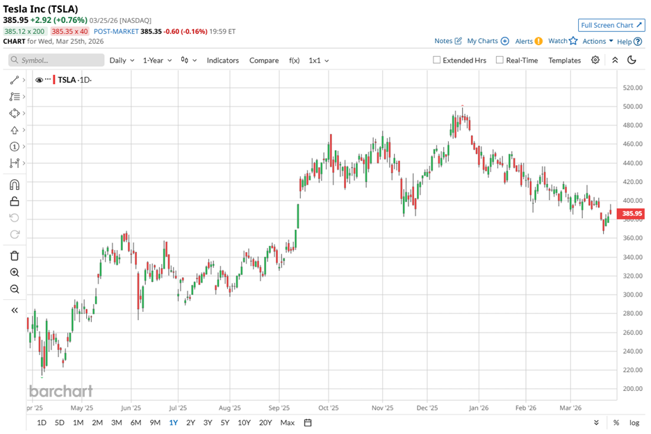 Tesla carries a market cap of approximately $1.45 trillion, reflecting both dominance and expectation. Over the past 52 weeks, the stock has gained nearly 36.77%, though it has pulled back 17.26% year-to-date (YTD), signaling some near-term pressure.