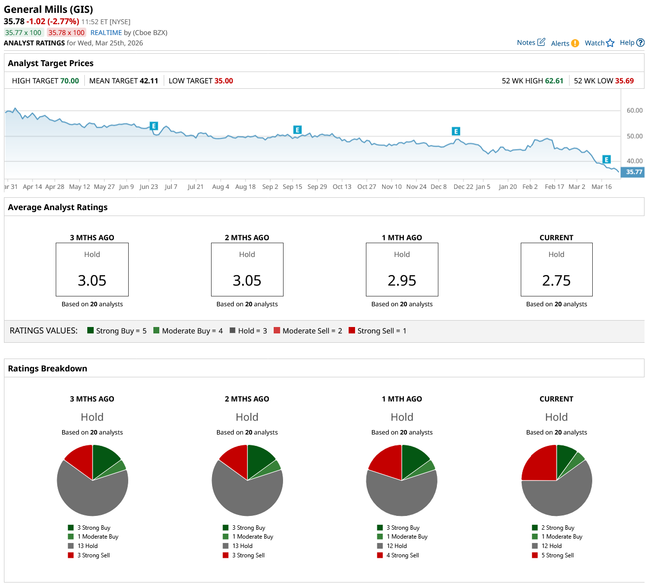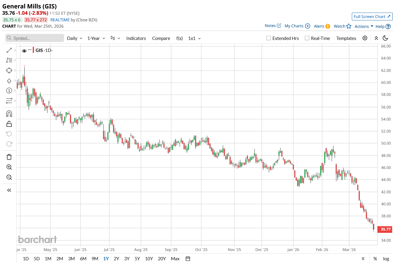 Shares of General Mills have been under significant pressure, reflecting a combination of weakening demand trends, margin compression, and broader concerns across the packaged food sector. On a year-to-date (YTD) basis, the stock is down around 23%, driven by a sharp selloff as earnings expectations deteriorated.