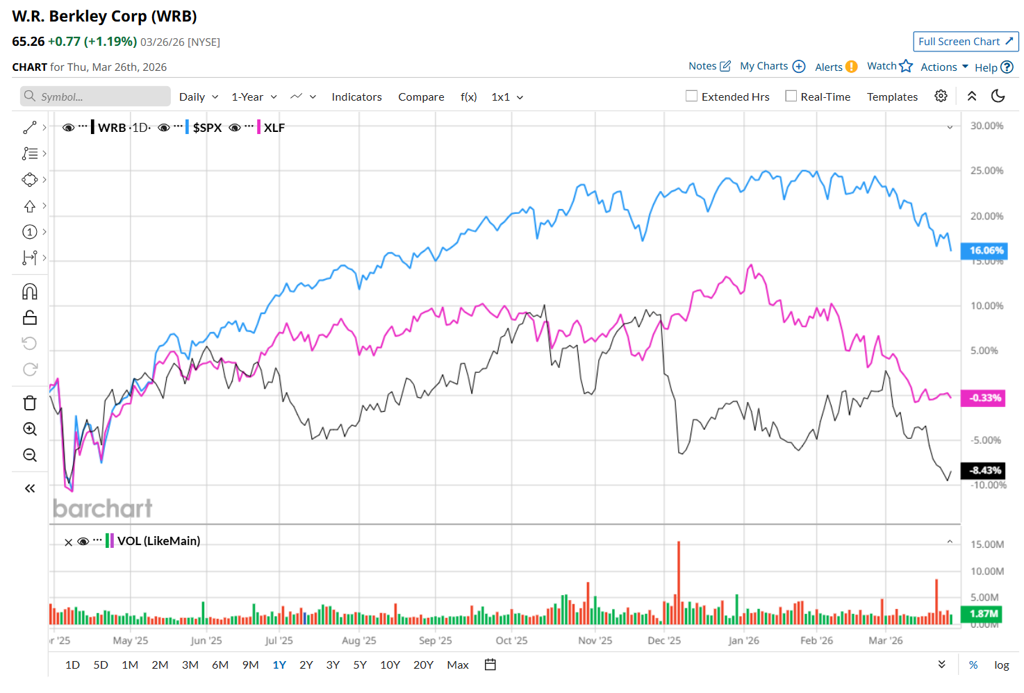 Shares of WRB have gained marginally over the past 52 weeks, underperforming the S&P 500 Index's ($SPX) 13.4% return over the same time frame. However, it has outpaced the State Street Financial Select Sector SPDR ETF’s (XLF) 2.5% drop over the same time period.
